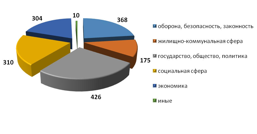 Тематическая классификация обращений: государство, общество, политика – 426 (в том числе по вопросам конституционного строя и совершенствования законодательства – 239, по основам государственного управления – 187); жилищно-коммунальная сфера – 175 (коммунальное хозяйство – 81, жилищные вопросы – 94); оборона, безопасность, законность – 368; социальная сфера – 310 (социальная защита – 79, образование и культура – 109, здравоохранение – 75, труд и занятость – 47); экономика – 304 (финансы – 32, экология – 50, сельское хозяйство – 29, хозяйственная деятельность – 193); иные вопросы – 10.