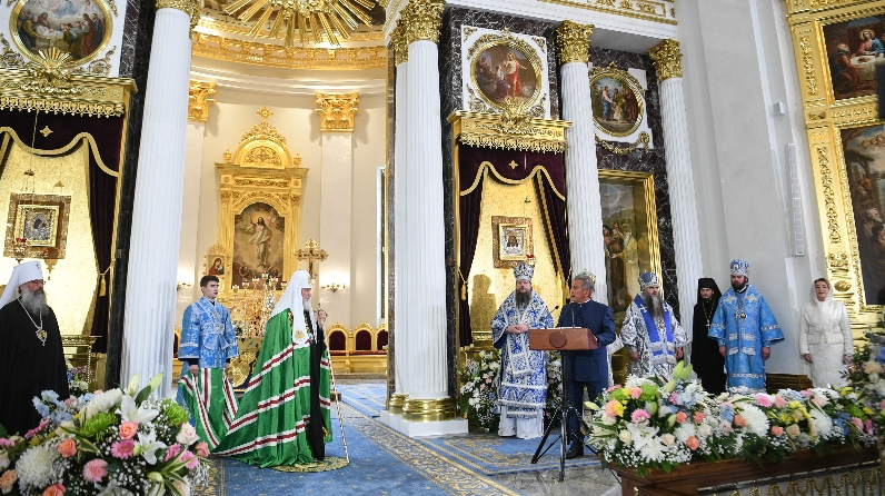 «Нәкъ биш ел элек без изге Патриарх Кирилл җитәкчелегендә торгызыла торган гыйбадәтханә нигезенә беренче ташны салдык. Һәм менә бүген бу мәһабәт соборда Патриарх һәм дәрәҗәле кунаклар катнашында янә илаһи литургия ясала. Татарстан башкаласы һәм безнең данлы Ватаныбыз үзенең төп рухи хәзинәләренең берсен алды», — диде ул.